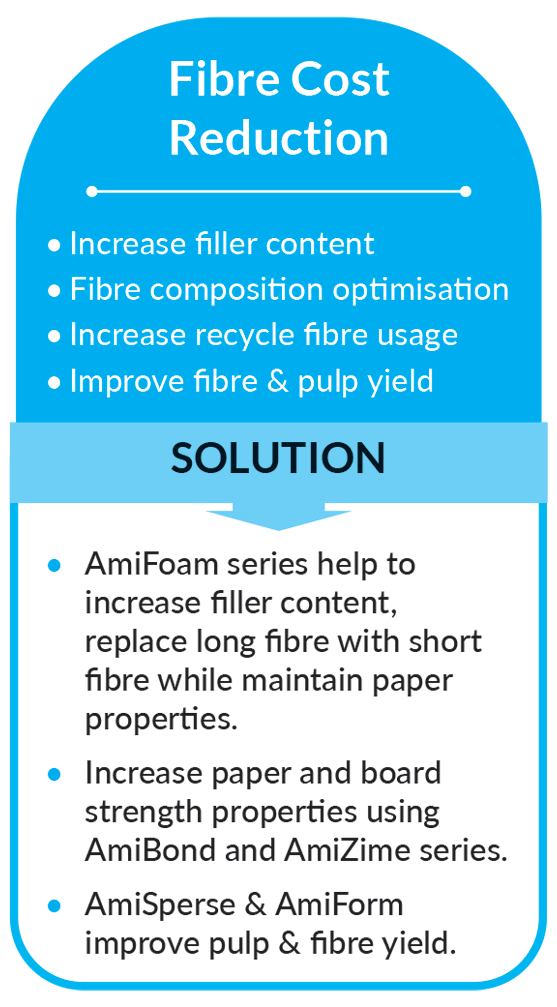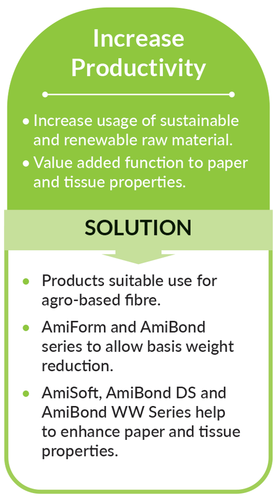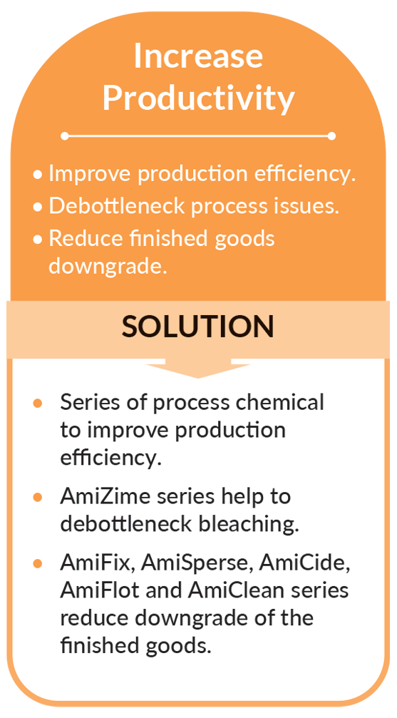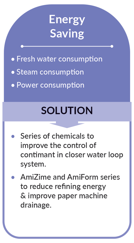 Good retention and drainage are key factors that could enhance the productivity and efficiency of your paper mill. Without an effective retention program, various particles are not retained on the sheet, leading to deposit problems, sheet breaks, and sheet defects. Poor retention of wet additives would also increase chemicals cost. A good retention program minimizes these problems. Our retention and drainage aids provide numerous benefits, including increased machine runnability, reduced deposits, reduced sewer loss, and reduced downtime for wash-ups.